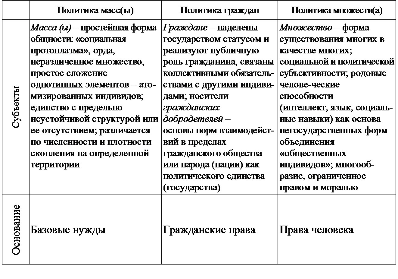 Заметим, что в упомянутом выше исследовании основное внимание было сосредоточено на сравнении сущностно противостоящих друг другу (но не взаимоисключающих) типов массовой политики – политики масс и политики граждан; были проанализированы их институциональные основания и условия их потенциального разворачивания в России. За скобками была оставлена политика множеств, поскольку это инновационный тип массовой политики. Это новая политика, контуры которой только намечаются – как в России, так и на Западе. Не рассматривалась и еще одна гипотетическая модель, противоположная массовой политике, – полная аполитичность масс и редуцирование политического, сведение его к административным практикам узкого круга («элиты»).