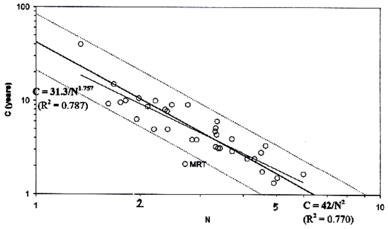Это график рассеивания по двум параметрам – длительности существования правительства и эффективному числу партий. Для удобства и наглядности обе шкалы логарифмические. Тонкая центральная линия – это идеальная (best-fit) прямая, исчисленная по методу наименьших квадратов (МНК). Толстая центральная линия – это логически предсказанная прямая наклона -2 (для логарифмов). Обе прямые заметно близки друг к другу; это значит, что логическая модель соответствует реальности. Средняя продолжительность жизни кабинета равна 42 годам, разделенным на квадрат эффективного числа партий [Taagepera, Sikk, 2010].