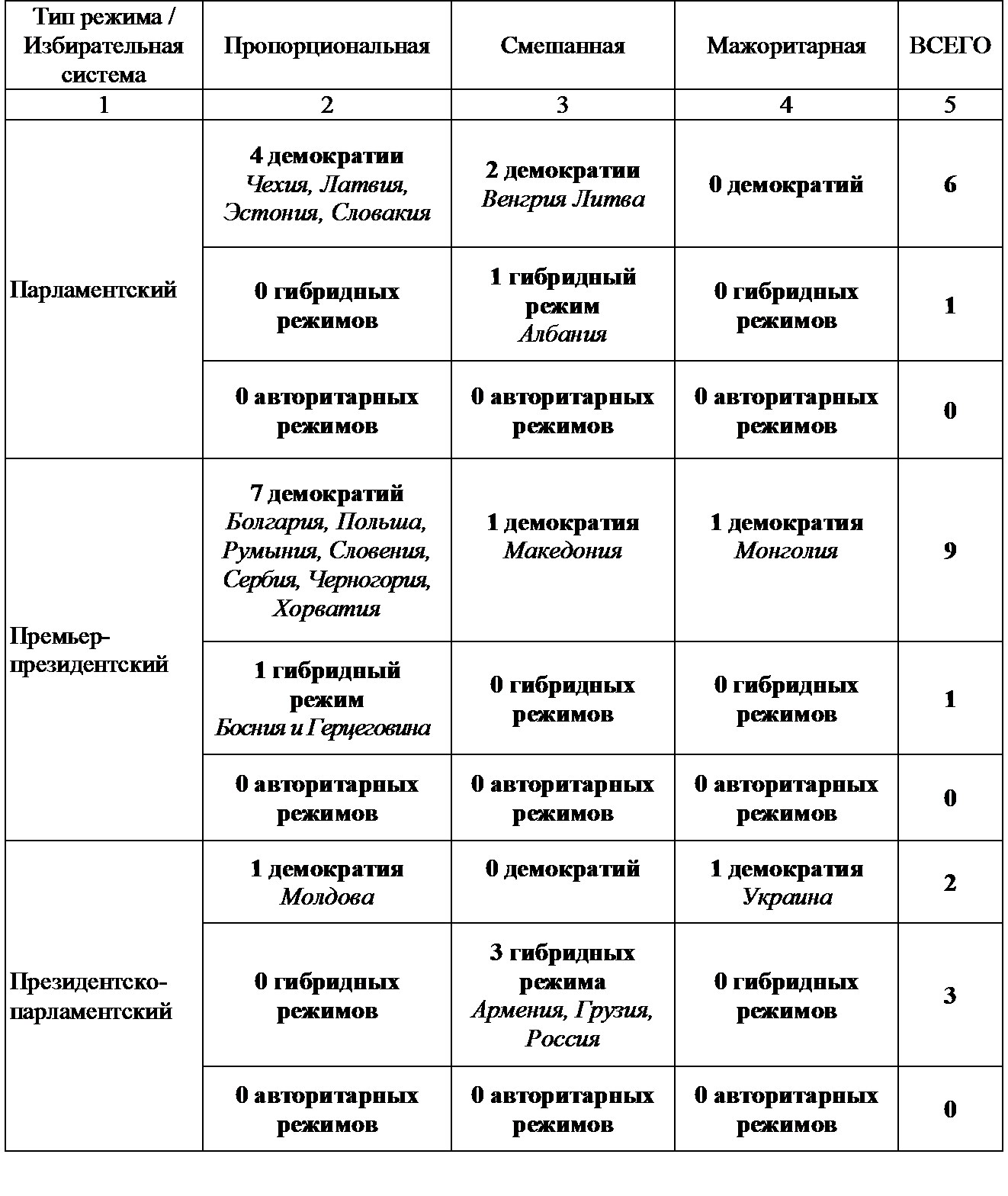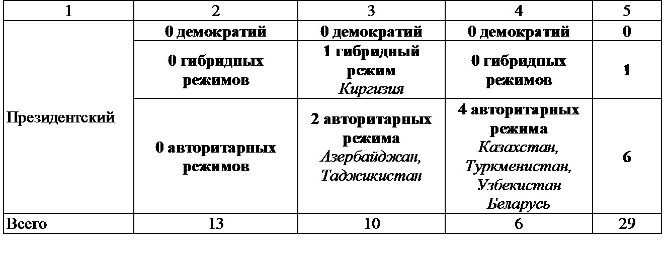 Примечания: Типология политических режимов, основанная на работе М. Шугарта и Кэри [Shugart, Carey, 1992], фиксирует институциональный выбор каждой страны на начало 1990‐х годов; классификация по уровню демократичности – на «The economist intelligence unit’s index of democracy 2010». Обратим внимание, что из двух режимов с относительно сильным президентом Молдова стала в 2001 г. парламентской республикой, а Украина несколько раз меняла свою избирательную систему и имела премьер-президентский режим в 2006–2010 гг. Граница между чисто президентским и президентско-парламентским режимом на постсоветском пространстве условна: определять ее только по конституционной формулировке исполнительных полномочий президента некорректно, если роль парламента вообще и в формировании кабинета министров, в частности, чисто номинальна. По первым конституциям президент возглавляет исполнительную власть и / или реально не делит полномочий с парламентом в ее формировании в Туркменистане, Таджикистане, Азербайджане, Казахстане, Киргизии (в последних двух случаях поправки к конституциям наделили парламент более широкими полномочиями в этой области); в Узбекистане и Беларуси формально требуется утверждение кандидатуры премьера парламентом, но парламенты в этих странах никогда не обладали реальной автономией от президентской власти.