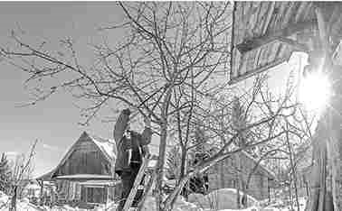 • Непобеленные стволы и основания скелетных ветвей молодых деревьев особенно подвержены солнечным ожогам и разрушениям коры. Еще не поздно это исправить. Известь или мел быстро смываются осадками. Лучшие результаты дает обработка коры синтетическими красками и смесями, которые имеются в продаже. В их составе есть антисептические добавки, способствующие заживлению ран, дезинфицирующие ствол и ветви, снижающие численность зимующих вредителей и возбудителей болезней. Важно нанести двойной слой краски с южной стороны стволов, где контраст дневных и ночных температур максимален.