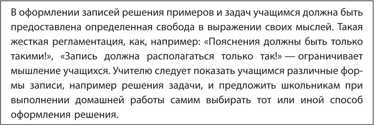 Жесткая регламентация нужна в тех случаях, когда учитель ставит целью обучение учащихся новым формам записи. В то же время предоставление неограниченной свободы делает записи сумбурными, бессистемными, при проверке затрудняет понимание хода мыслей учащихся, а главное – причины их ошибок.