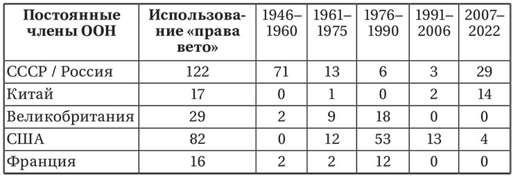 Что касается США, то американцы являлись абсолютными рекордсменами по применению вето в период с 1976 по 2006г., задействовав его 66 раз. Однако в последние 15 лет Вашингтон заметно сократил использование этого инструмента (всего четырежды за последние 15 лет) и отныне прибегает к нему лишь для защиты интересов Израиля в контексте ближневосточного урегулирования. Великобритания и Франция не применяют право вето с 1989 г. Большинство случаев блокирования Лондоном и Парижем документов Совета Безопасности ООН пришлось на период 1976–1990 гг. В рамках указанного временного промежутка британцы и французы совместно с американцами, в частности, голосовали против резолюций с осуждением режима апартеида в ЮАР и действий южноафриканцев в ходе войны за независимость в Намибии, а в 1989 г. воспрепятствовали осуждению в Совете американского вторжения в Панаму. Кроме того, Париж и Лондон накладывали вето на невыгодные для них резолюции по колониальной тематике: по ситуации вокруг острова Майотта в 1976 г. и Мальвинских / Фолклендских островов в 1982 г. соответственно.
