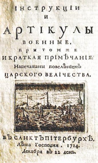 Титульный лист «Инструкций и Артикулов военных» 1714 г. – первого законодательного акта, регламентировавшего судебно-медицинскую деятельность