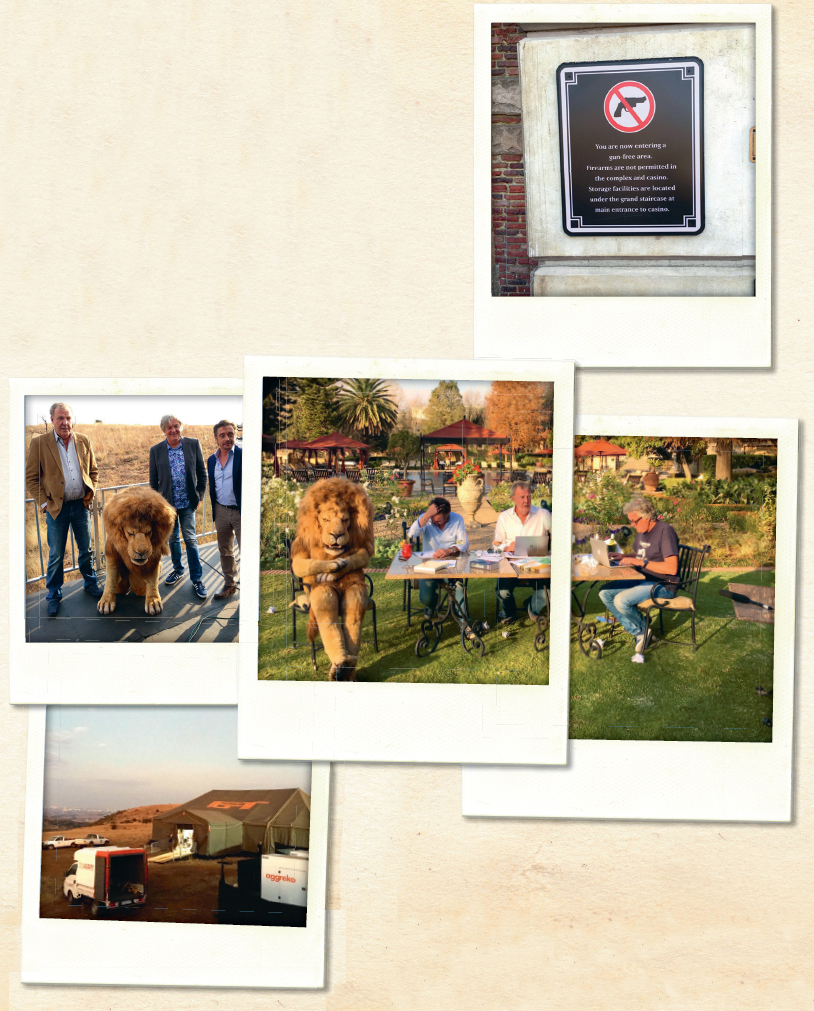 First time we’d seen the tent put up since we gave it a trial run on a damp farm in Hertfordshire a few months ago. Looks a bit better here. First night, sent James off to go spinning. He came back to the hotel bar covered in dirt and stinking like a tyre fire. Decided having a beer was more important than getting changed, even though bar was packed. Maybe people think he always smells like that. Lion costume delivered, to ‘eat’ a star guest. It’s been hard to find a realistic one. Ignored Jeremy’s suggestion to ‘use a real lion’. Next day we filmed the show. Presenters liked the idea of first studio recording being here because they’ve performed live shows in South Africa before and the audiences are always amazing which makes everything go with a swing. Sure enough, they were great. Everyone on the crew happy, had a small party back at the hotel at which Richard bought half the bar and Jeremy made our Dutch tech team race around the hotel garden. Up late this morning, about to go to airport then remembered we needed to make short film for very important American TV critics’ conference apologising for not being there. Remembered animal costume used yesterday so got one of crew to put it on and deliver message to camera as a talking lion while presenters sat in the background. American TV critics will think we’re a bit strange. Oh well. See you soon,