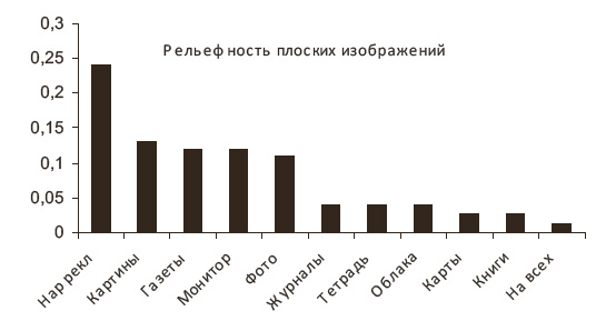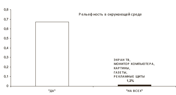 Сравним ответы студентов с опросами, проведенными в средне-образовательных учреждениях. На рисунке 3 построены диаграммы ответов учащихся по восприятию рельефности. Выборка составляла 632 человека. 68,3 % участников опроса утверждают о восприятии рельефности (диаграмма «да»), около 1,2 % воспринимают рельефность на любых плоскостных изображениях. Итого 7–8 человек утверждают, что все плоскостные изображения воспринимают как трехмерные объекты.