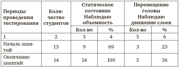 В таблице размещены результаты опросов студентов обучения 2013–2014 уч. г. По столбцам 3–4 видно, что с 69 до 100 % увеличивается способности студентов воспринимать статические состояния глубины предъявляемых им тестовых (пилотных) изображений. Особо отметим столбец 5. На принципы «построения» опроса получен патент (Антипов, 2015).