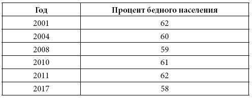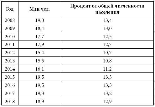 Социальная политика государства в 2009–2013 годах способствовала существенному сокращению численности бедных. Согласно данным Росстата численность населения с денежными доходами ниже величины прожиточного минимума сократилась с 19,0 млн человек в кризисный 2008 год до 15,5 млн в 2013 году. Однако с момента введения политических и экономических санкций вкупе с кризисными явлениями в мировой экономике фактически все достижения этого периода были отыграны назад, и к концу 2018 года численность бедных людей возросла до 18,9 млн человек (см. табл. 1.1).