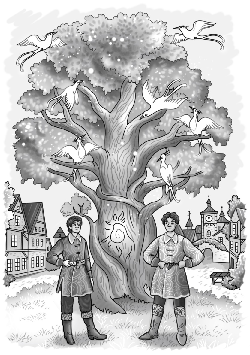 Вынул он из кармана волшебное перо и подбросил его вверх. Тут же взмыла в небо стая волшебных птиц. Закружились они над древом, сели на его ветки и запели песню. И всё вокруг изменилось: в дома людей снова вернулись радость и счастье.