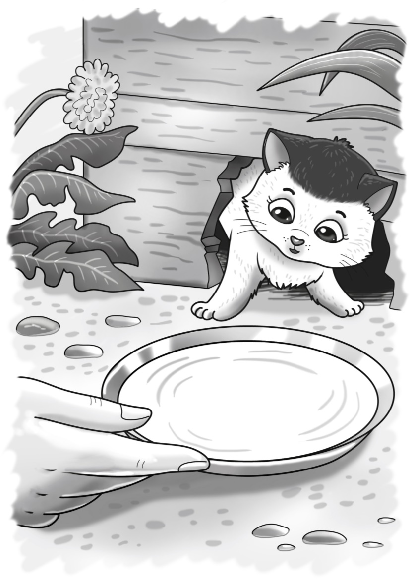 Зацокали красные туфельки. На их лаковой поверхности плясали солнечные зайчики. Раздалось тихое «кис-кис», и рядом с сарайчиком появилась мисочка с молоком. Настоящим, тёплым, вкусным. Чепчик не поверил своим глазам. Он невольно облизнулся, затем зажмурился и снова широко распахнул глаза. Ух ты! Молоко не исчезло!