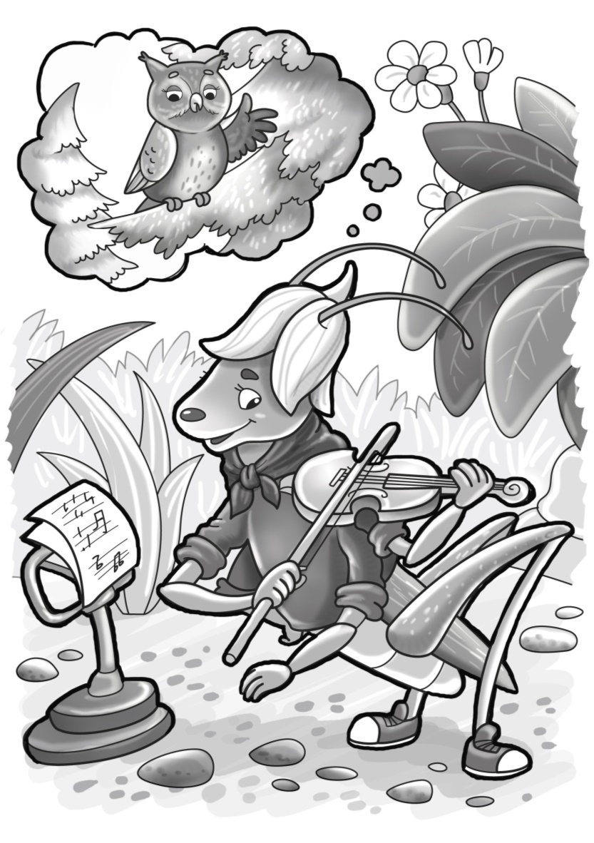 Жил кузнечик на опушке,Под кустом, в своей избушке.Удивляя всех талантом,Стать мечтал он музыкантом.Что ни утро, брал он скрипкуИ под деревом с улыбкой«ДО-РЕ-МИ…» играл как мог,Но недолгим был урок.Уставал пиликать кроха,Получались ноты плохо,Он сердиться начиналИ занятия бросал.Но на месте не сиделось,Повидать друзей хотелосьДа попрыгать хоть часокС лепестка на лепесток.Воротившись на опушку,Спать ложился на подушку,Спозаранку вновь подъём,Так летели день за днём…Отложив однажды скрипку,Услыхал малыш: «ОшибкуДопускаешь ты, дружок!Всё по травке прыг да скок?..»Глядь – сова на ветке ели,Смотрит строго: «НеужелиНе смекаешь? Так мечтыНе достигнешь вовсе ты!»Музыкант вздохнул: «Ну, знаешь,Ты зазря меня ругаешь!Занимался битый час,Отдохнуть хочу сейчас».Собеседница застыла,Почесала свой затылокИ промолвила: «Угу,Что ж, помочь тебе смогу!Неспроста в гостях у гномаЯ была недавно дома.Мне поведал он секрет,С ним добьёшься ты побед!Тайну с радостью открою!Покоришь весь мир игрою,Приумножишь свой талант —Выйдет знатный музыкант!Повторяй стихотворенье:„Чуть упорства, чуть терпенья,Чуть усердного труда —Воплотится в жизнь мечта!“»Пробурчала и исчезла…Взялся вновь герой за дело:Целый день малыш играл,Заклинание шептал…Тихо вечер подобрался,И тогда скрипач признался:Велика секрета роль —Вышла чисто нота «соль»!