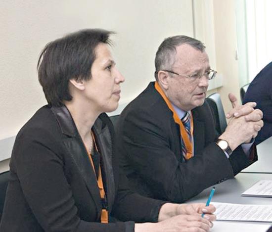 Е. Б. Бухарова и С. А. Подлесный на рабочем заседании, СФУ, 2011 г.
