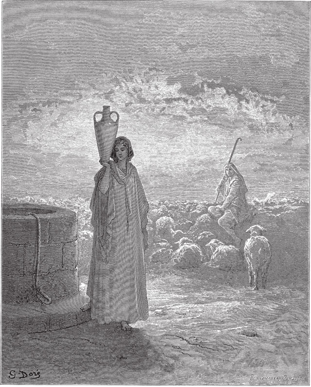 Сменила собою прохладаПолдневного зноя истому…Лавана богатого стадоСпустилося вниз к водоему.Под сенью дубравы зеленой,Где веяло чудною былью,Любуясь прекрасной Рахилью,Иаков стоял, восхищенный.Рукой обнаженной и стройнойКувшин свой она поднимала,И краска в лице проступала,И грудь волновалася знойно.Под взором горячим и властнымВ ней сердце сильнее забилось,И что-то в груди пробудилосьВпервые порывом неясным.В ответ на немые вопросыШептал он ей тихие речи,Любуясь, как черные косыНа смуглые падали плечи.Отдавшись восторгам свиданья,Не чаял он, чуждый обмана,Что ждут его в доме ЛаванаЧетырнадцать лет испытанья.Увы! Предназначено былоТрудиться ему ежечасно:Семь лет из-за Лии немилой,Семь лет – для Рахили прекрасной.
