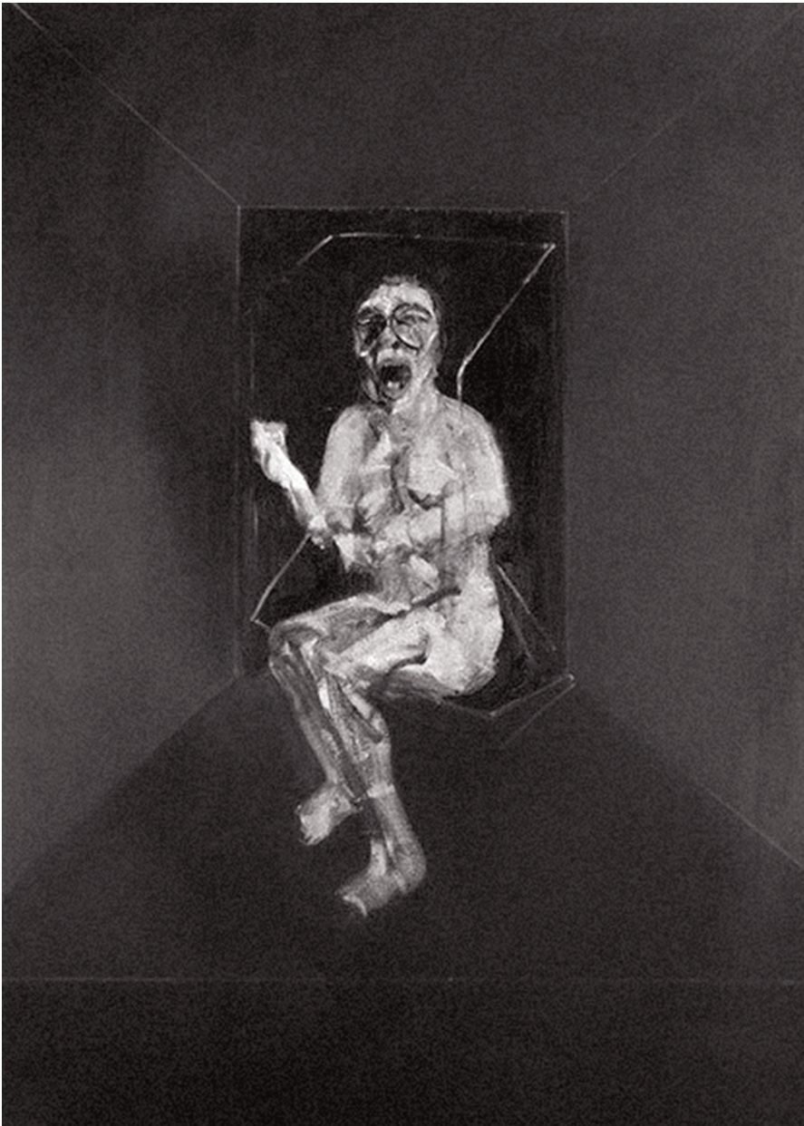 Более откровенно Бэкон посвятил Учительнице картину 1957 года «Этюд для «Броненосца “Потёмкин”». К крупному плану Няни он подставляет все тело целиком, абсолютно голое, как будто ему нужно дать избыток плоти ревущему рту. Как напоминает Жиль Делёз, Бэкон изображает не лица, а головы, поскольку «лицо – это структурированная пространственная организация, покрывающая голову, тогда как голова подчинена телу, даже если она – просто его верхушка»[39]. В этой операции крик играет ключевую роль: «[открытый] рот обретает ту силу нелокализованности, которая превращает всю плоть в голову без лица»[40].