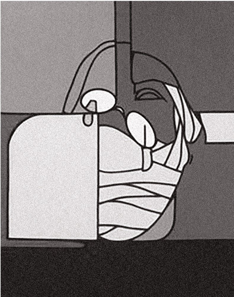 В своем «Броненосце» Адами перерабатывает мотив кричащей Учительницы в совершенно противоположном от Бэкона направлении: там, где Бэкон широко, навечно раскрывает ее рот, Адами закрывает и обтягивает его в кульминации немоты. Там, где Бэкон заинтересован в непристойности и естественности ротового отверстия, Адами усиливает политическое измерение эйзенштейновской сцены. В фильме Эйзенштейна бессильный крик Учительницы символизирует царские репрессии, которые затыкают бунтовщикам рты, чтобы нельзя было услышать никакого протеста. Адами идет дальше: восстанавливая рот няни – дыру-рану – с помощью бинта, мумифицируя ее, он полностью лишает ее голоса и заставляет ее действительно замолкнуть, добавляя новый слой насилия к исходному образу. Там, где эйзенштейновская Горгона ужасала зрителя, Адами горгонизирует само изображение. Буквально представляя гэг, Адами переводит образы Эйзенштейна в обличение цензуры своего времени. Жестокость этого жеста усиливается контрастом серого цвета с другими цветами, как пятно тишины, вторгающееся в композицию, что дает особый акцент на разбитые стекла в кислотно-розовом цвете. Адами утверждал, что в живописи использование цвета равно использованию крупного плана в кино[50]. В дополнение к этому, бесчеловечность сцены подчеркивается гладкой и холодной текстурой акриловой краски, стилизованными очертаниями, а также ироничным использованием ярких, поп-артовых цветов. Все в этой холодной, плоской, металлической трактовке контрастирует с живой, органической плотью Бэкона. На жестокий киномонтаж Эйзенштейна Адами отвечает «деконструированной» сборкой элементов, фрагментированной поэтикой, которая усиливает потерю речи и зрения персонажем. На самом деле, сам процесс фрагментации жесток, так как он подразумевает принесение в жертву некоторых элементов: «[работы Адами] подобны рассыпанным фрагментам головоломки, отдельные фрагменты которой потеряны, как будто каждое изображение у Адами изначально было разрезано на полоски, а затем склеено с наложениями и утратами фрагментов»[51]. Эстетика «монтажей-образов»[52] Адами опирается на искажение исходного образца или образа и никогда не сохраняет целостность и единство лица. Рисуя, Адами практикует накожные надрезы, произвольные разрезы, которые вторят тому, как взгляд сам разрезает видимую реальность на произвольные фрагменты[53]. Не случайно в этом смысле, что во многих работах 1970 и 1971 годов Адами обращает своеобразное внимание на мотив очков – не только в своей вариации на образ Учительницы из «Броненосца “Потёмкин”», но и, например, в портретах Фрейда, Ганди, Джойса, где разъятый на части мотив очков воплощает безжалостную работу фрагментирующего взгляда, а также жестокий и безжалостный жест художника.