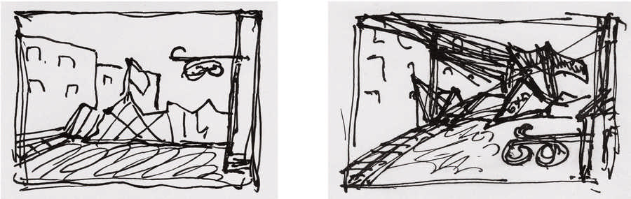 Деформированная и на первый взгляд почти неузнаваемая, баррикада оказывается в водовороте движения, которое разрушает спокойствие пространства в ее изображении. Разрушение этого пространства, возможно, наиболее отчетливо проявляется в паре линий, что, подобно паре натянутых проводов, тянутся от баррикады (объекта, расположенного в пространстве изображения) и оборачиваются вокруг правого верхнего угла рамки рисунка, тем самым предел изображения внезапно втягивается в пространство, которое он должен был отграничивать, в то время как объект, ранее гнездившийся в этом пространстве, выталкивается или даже «взрывается» со своего места. Ощущение изобразительной объективности и натуралистической описательности, которое характеризовало первый рисунок, во втором поглощено сущим субъективным беспорядком. Можно понять этот второй рисунок баррикады так, как будто в нем баррикада, вместо того, чтобы сдерживаться рисунком, внезапно завладела им сама. Как будто не просто созданная актом рисования, баррикада субъективно реорганизовала форму, следуя той логике, какую уже нельзя назвать просто логикой изображения, поскольку роль, которую баррикада играет в этой новой ситуации, также больше не является просто ролью обычного объекта или пассивной вещи.
