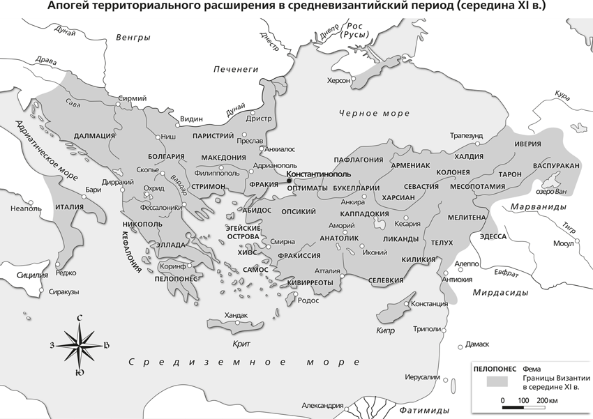Некоторое время спустя само существование восточного фланга империи оказалось под натиском арабов. Византия в считаные годы потеряла две самые процветающие провинции – Египет и Сирию. Арабская угроза сохранялась как на суше, так и на море вплоть до IX в., а Константинополь оставался для арабов желанной целью даже после знаменитой осады 717–718 гг. Затем наступил период византийской «реконкисты»: сначала империя отвоевывала земли у багдадских Аббасидов, потом, с 970-х гг., у каирских Фатимидов и одновременно – у Болгарского царства. Болгарию можно без преувеличения назвать второй империей на Балканах: наивысшей точкой расцвета было правление в начале X в. царя Симеона, выросшего в Константинополе. В первой половине XI в. Византия вновь достигает территориального максимума, связанного с правителями из так называемой Македонской династии (867–1056), точнее, после присоединения болгарских территорий Василием II, экспансионистская политика которого к тому времени позволила захватить север Сирии и Месопотамии, а в планах стояло постепенное вторжение на Кавказ.