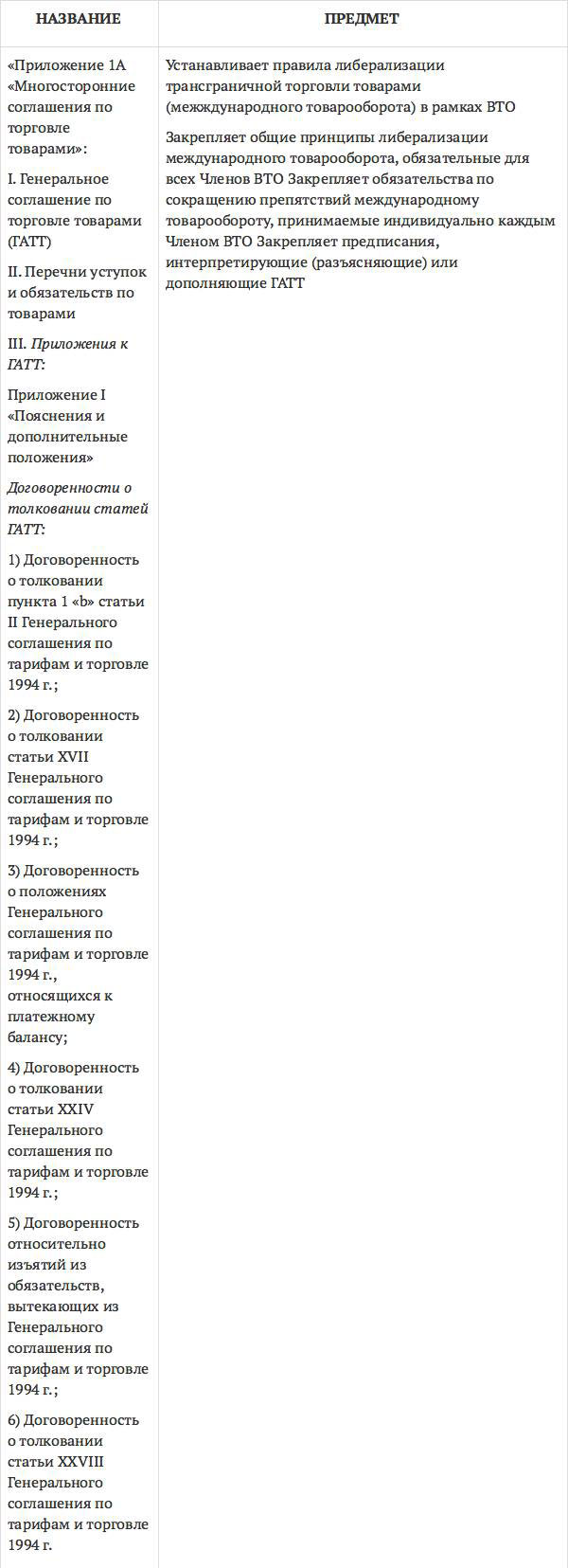 • во-первых, Генеральное соглашение по торговле товарами (ГАТТ) с изменениями и дополнениями, принятыми в ходе Уругвайского раунда (ГАТТ 1994 г.);