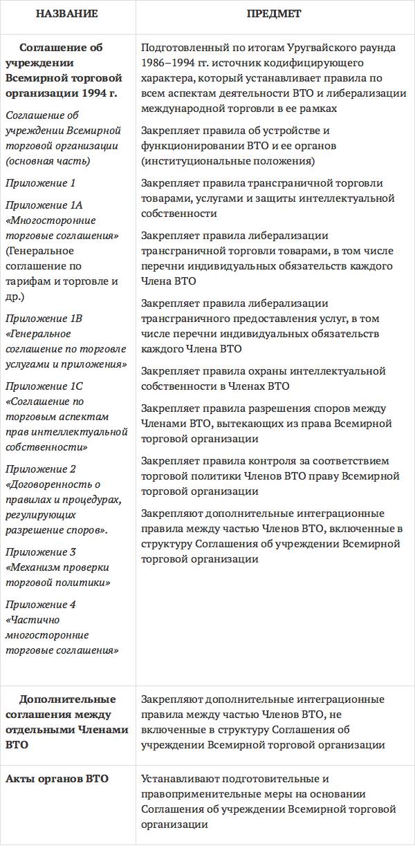 По общему правилу, закрепленному в основной части Соглашения об учреждении ВТО (ст. II «Сфера деятельности»), данное Соглашение, включая приложения к нему, образуют единый источник права, нормы которого распространяются на всех Членов организации. Соответственно, любое государство, вступающее в ВТО, с момент вступления становится участником и ГАТТ, и ГАТС, и ТРИПС, а равно других указанных выше соглашений и договоренностей. Указанное правило в западной правовой доктрине получило название принципа единого обязательства50 или единого соглашения51 Членов ВТО.