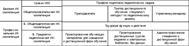 На основе анализа образовательных и профессиональных стандартов педагогов вуза и школы, научно-методических разработок в области повышения квалификации педагогов в сфере информатизации в России и за рубежом можно выделить два основных уровня ИКК преподавателей вузов: общепользовательский и профессиональный, которые должны быть сформированы в процессе профессиональной подготовки или переподготовки, т. е. в системе профессионального или дополнительного профессионального образования. На каждом уровне предусматривается подготовка по нескольким профильным направлениям. Например, уровни Б и В могут быть представлены несколькими профильными направлениями: предметно-методическим, дистанционно-методическим, учебно-административным, медиатечным. Причем внутри второй ступени предлагается выделить в соответствии с профессиональным стандартом два уровня: