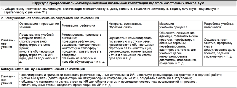 Преподаватель иностранных языков должен в совершенстве владеть не только методическими приемами обучения, особенностями организации учебного процесса и воспитания, но и обладать высокой языковой культурой, многообразием языковых форм выражения мыслей на преподаваемом языке и фоновыми культурными знаниями. Понятие коммуникативной иноязычной компетенции многоаспектно и ее структура, включающая лингвистическую, дискурсивную, социокультурную, социолингвистическую, стратегическую и социальную компетенции, подробно описаны в Общеевропейских компетенциях владения иностранным языком: изучение, преподавание, оценка, разработанном Советом Европы. В РФ нет жестко установленных требований к уровню владения ИЯ в профессиональной деятельности педагога. Предполагается, что уровень владения ИЯ в системе основного общего и среднего общего образования должен быть не ниже В2 согласно Общеевропейской шкале оценивания. В системе профессионального и дополнительного образования – не ниже C1.
