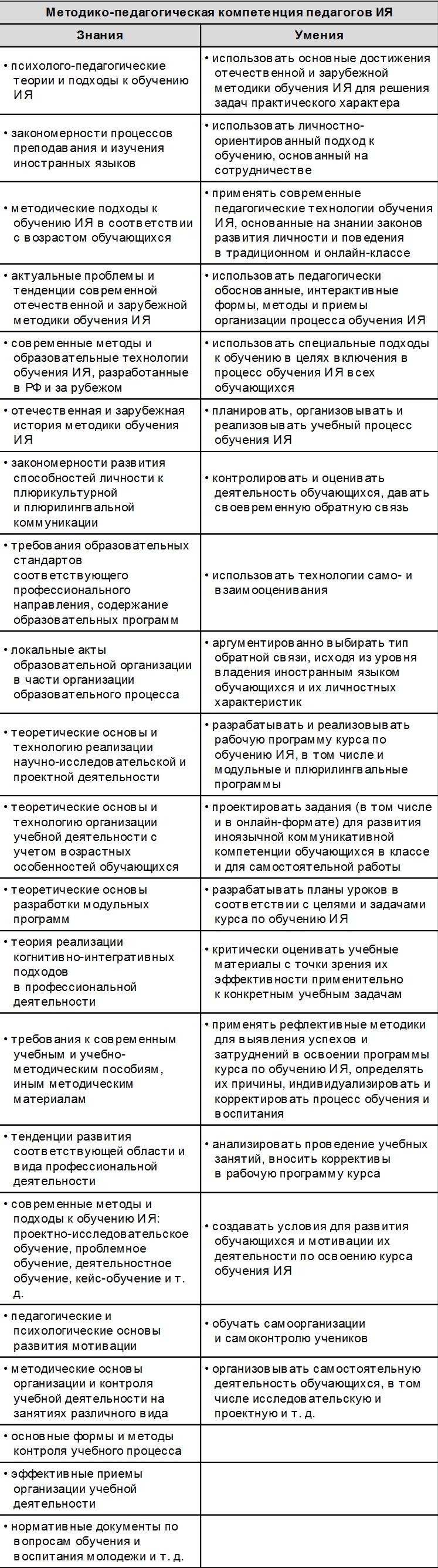 Методико-теоретические компетенции базируются на шести профессиональных макрокомпетенциях ФГОС ВО Лингвистика, необходимых для осуществления лингводидактической деятельности будущих специалистов. Однако при разработке карты компетенций требуется уточнение конкретных умений будущих педагогов ИЯ, обобщающее отечественный и зарубежный опыт в области методики обучения иностранным языкам в высшей школе. Ниже представлены некоторые умения, которыми должны обладать педагоги ИЯ (см. таблицу 5).