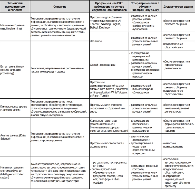 С каждым днем число технологий искусственного интеллекта, которые шаг за шагом внедряются в нашу повседневную жизнь, продолжает расти. В одном из наших предыдущих исследований были описаны пять наиболее распространенных технологий искусственного интеллекта, на основе которых создаются новые программы, программное обеспечение и информационно-коммуникационные технологии нового поколения, которые можно использовать в обучении иностранному языку. К таким технологиям искусственного интеллекта можно отнести следующие: машинное обучение (machine learning), естественный язык (natural language processing), компьютерное зрение (computer vision), анализ данных (data science) и интеллектуальную систему обучения (intellectual computer system). В таблице 7 представлено описание этих технологий искусственного интеллекта, а также приведены примеры программ или информационно-коммуникационных технологий, работающих на основе этих пяти технологий искусственного интеллекта, с указанием сферы применения в обучении иностранному языку и решаемых ими дидактических задач.