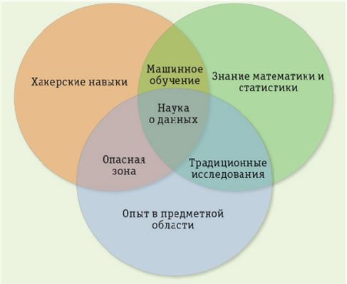 Таким образом, «большие данные» – это метафора, которая относится не только и не столько к объему данных, сколько к доступности и сложности их структуры. Иногда для больших данных определения используют критерий четырех V: объем (volume), разнообразие (variety), скорость (velocity) и ценность (value). Появившись в качестве концепции науки о данных, большие данные также являются межотраслевой областью практической деятельности. Дрю Конвей (Drew Conwey) выделил три области компетенций, необходимых «ученому по данным» (data scientist): знание математики и статистики, наличие опыта в предметной области, а также хакерские навыки. Он также подчеркнул, что на пересечении предметной области и хакерских навыков существует «зона опасности», из чего, в частности, следует, что данные могут использоваться несанкционированно, о чем прямо говорить не принято (см. также: исследования интернета).