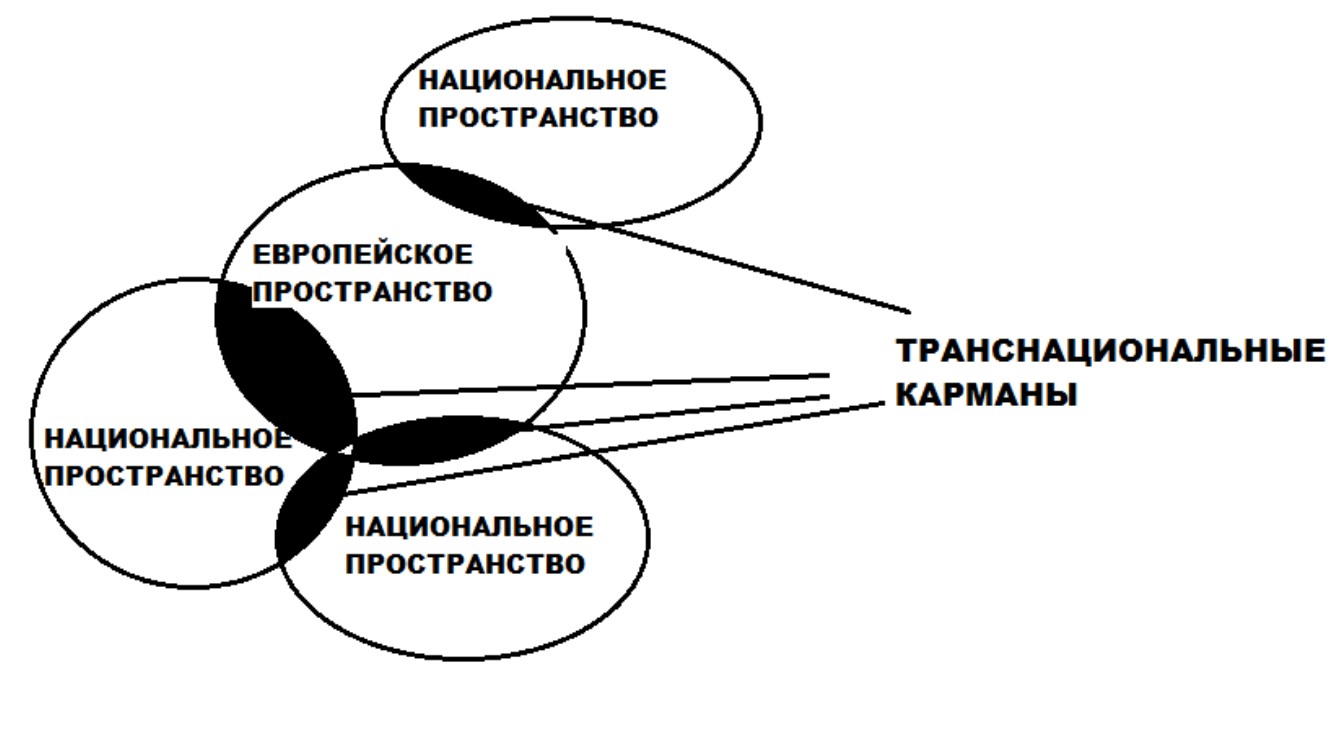 Функциональный тип иной: в нем сосуществует, при неограниченном числе образующихся уровней, множество центров принятия решений в различных сферах, причем разные юрисдикции частично совпадают или пересекаются друг с другом, порождая транснациональные «карманы», как на приведенном выше рисунке. Здесь участники политического процесса, уклоняясь от вступления в конфликт, могут «голосовать ногами»: сменить юрисдикцию по своему желанию (происходит конкуренция юрисдикций), а территориальные границы не имеют большого значения. Акторы различных уровней транснационально взаимодействуют с тем центром, который задает правила, для них предпочтительные.