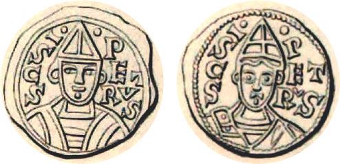 2. Прориси монет папы Сергия III (904–911). Источник: Promis D. Monete dei Romani Pontefici avanti il Mille. Torino, 1858. Tav. VII. Nr. 1–2.
