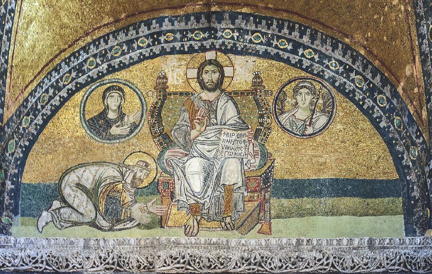 7. Император перед Христом. Мозаика в нартексе храма св. Софии Константинопольской. 886–912 (?) гг. Источник: Wikimedia Commons. URL: https://commons.wikimedia.org/wiki/File: Hagia_Sophia_Imperial_Gate_mosaic_2.jpg.