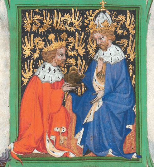 8. Король Чешский выполняет службу виночерпия перед императором. Иллюстрация к Золотой булле 1356 г. (рукопись короля Вацлава IV). Миниатюра. Ок. 1400 г. Источник: Österreichische Nationalbibliothek. URL: https://digital.onb.ac.at/RepViewer/viewer.faces?doc=DTL_3356370&order=1&view=SINGLE.