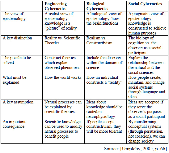 In spite of the fact that the table is called "Three versions of cybernetics," Western scholars only single out cybernetics of the first and second orders. Cybernetics of the second order includes a biological and social version. It arose from "experimental epistemology." The goal was to understand the processes of cognition on the basis of neurophysiological experiments, as a result of which cyberneticians came to the conclusion that the observer can not be excluded from science.