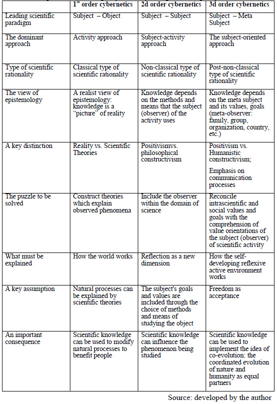 – Western scholars do not consider third-order cybernetics to be necessary, since the inclusion of an observer (subject) in the field of science, from their point of view, solves the problem of including social values and goals into consideration [Medvedeva, Umpleby, 2003];