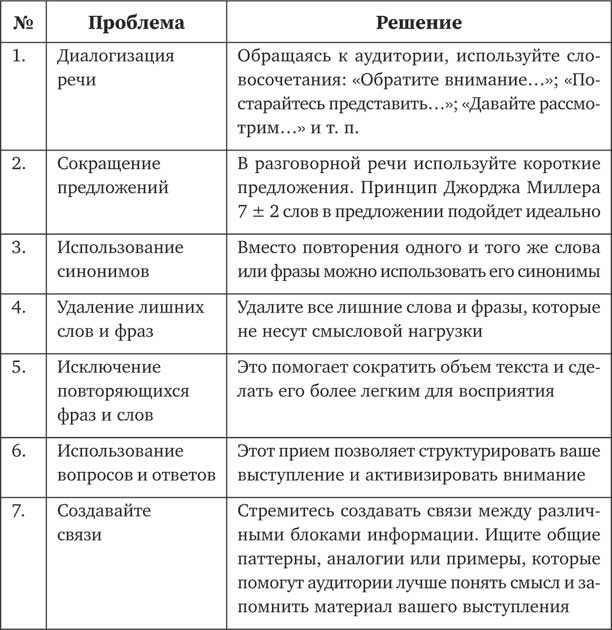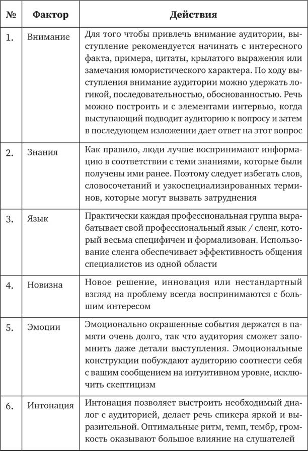 Восприятие информации зависит от опыта, образования, стереотипов, культурных особенностей, социальных установок и т. д. Но вместе с тем существуют и общие факторы, на которые стоит обратить внимание при адаптации текста выступления (см. табл. 6).
