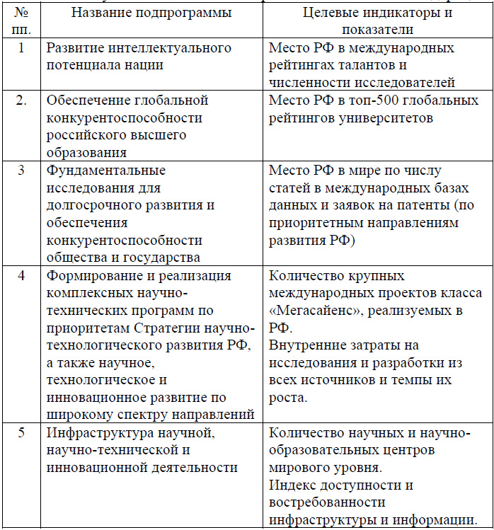 Структура и целевые индикаторы Государственной программы «Научно-технологическое развитие Российской Федерации»