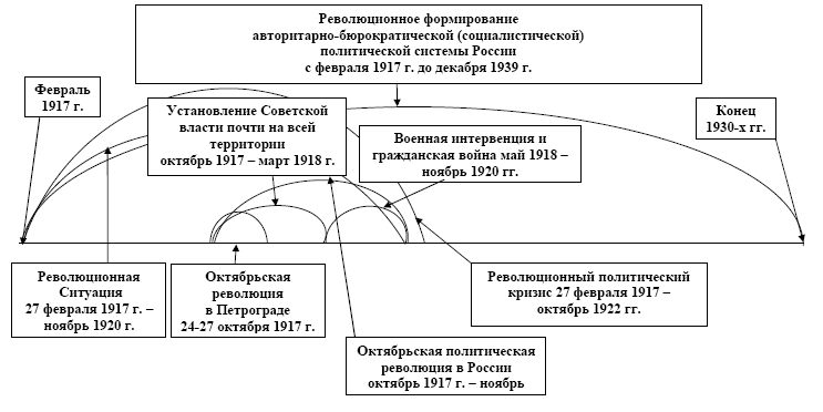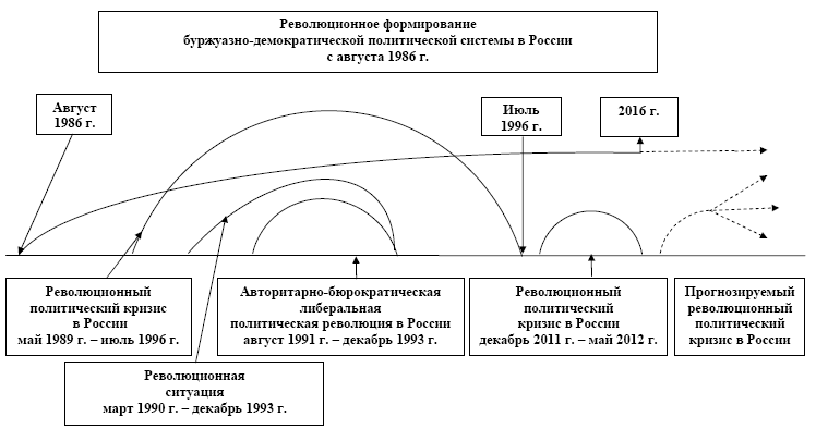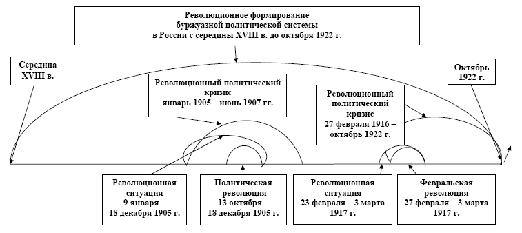 В истории России XVIII–XXI вв. можно выделить следующие политические революции в широком и узком смысле слова. Революционное формирование буржуазной политической системы (политическая революция в широком смысле слова) с середины XVIII в. до октября 1922 г. включало две буржуазные политические революции октября-декабря 1905 г. и февраля 1917 г. Революционное формирование авторитарно-бюрократической (социалистической) политической системы с февраля 1917 г. до конца 1930-х гг. включало Октябрьскую политическую революцию в России с октября 1917 г. до ноября 1920 г. Революционное формирование буржуазно-демократической политической системы началось с осени 1986 г. и продолжается в России до настоящего времени. Оно включило в себя авторитарно-бюрократическую либеральную политическую революцию 1991–1993 гг., которая привела на современном историческом этапе к утверждению бюрократического авторитаризма с опорой на прозападную монополистическую буржуазию, многопартийной политической системы при однопартийном политическом режиме.