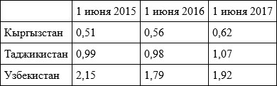 Таблица 10. Число иностранных граждан из стран Средней Азии, находящихся одновременно на территории России (2015–2017 гг.), млн человек