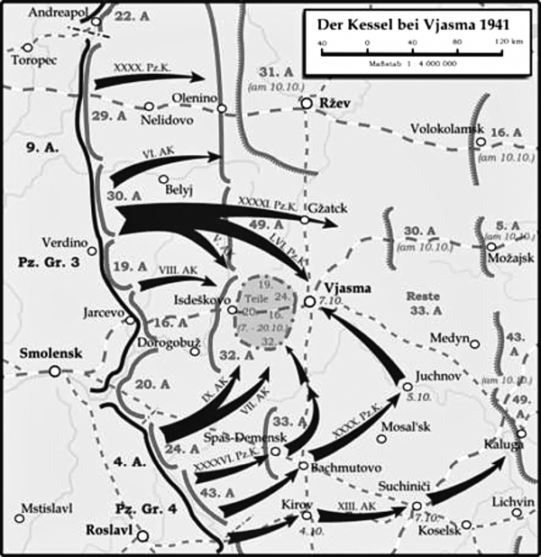 К исходу 4 октября острие танкового клина генерала Г. Гота (3-я танковая группа) находилось уже в 60, а Э. Гепнера (4-я танковая группа) – в 70 км от Вязьмы. Советские войска, удерживавшие позиции между флангами участков прорыва, были удалены от города на 100–110 км. На просьбу командующего Западным фронтом разрешить отход к Ржевско-Вяземскому рубежу Верховный Главнокомандующий Сталин не ответил[43]. Когда же Конев попросил разрешения отвести свои войска на линию Гжатска у начальника Генерального штаба Б. М. Шапошникова, последний лишь ответил, что доложит об этом Ставке. Но решения Ставки в этот день не последовало[44]. То, что советские войска продолжали удерживать фронт по обеим сторонам шоссе Смоленск – Москва, было выгодно германскому командованию. Оно теперь ожидало, что в окружение попадет около 70 крупных соединений в районах Брянск и Вязьма[45].