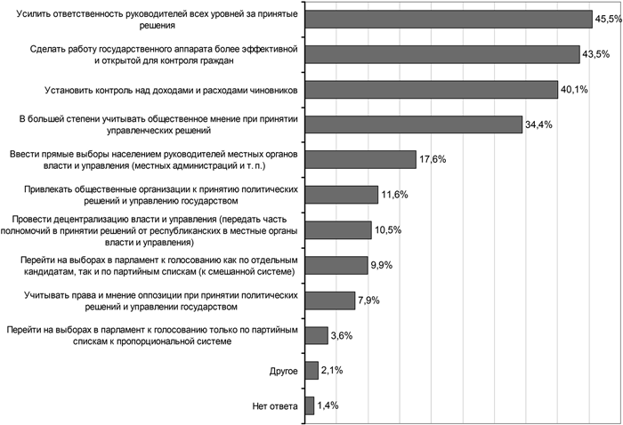 Наиболее важными переменами, востребованными обществом, в контексте модернизации политической системы страны, по мнению населения, являются: