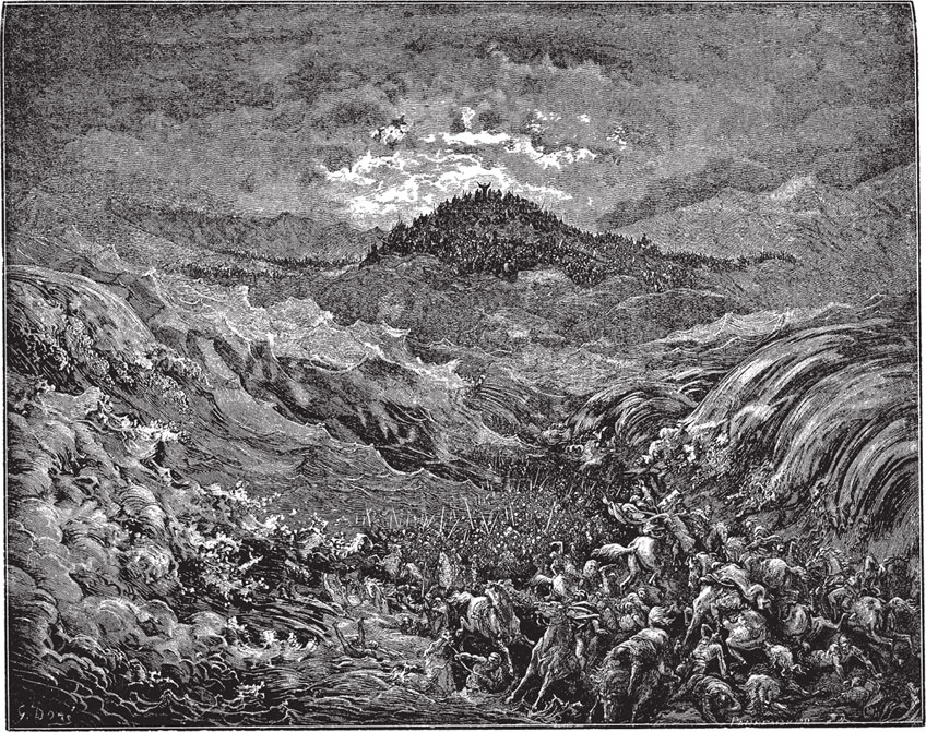 ГИБЕЛЬ ЕГИПТЯН В ЧЕРМНОМ МОРЕ. ИСХОД, ГЛ. 14, СТ. 27–28. И простер Моисей руку свою на море, и к утру вода возвратилась в свое место… и покрыла колесницы и всадников всего войска фараонова… не осталось ни одного из них.
