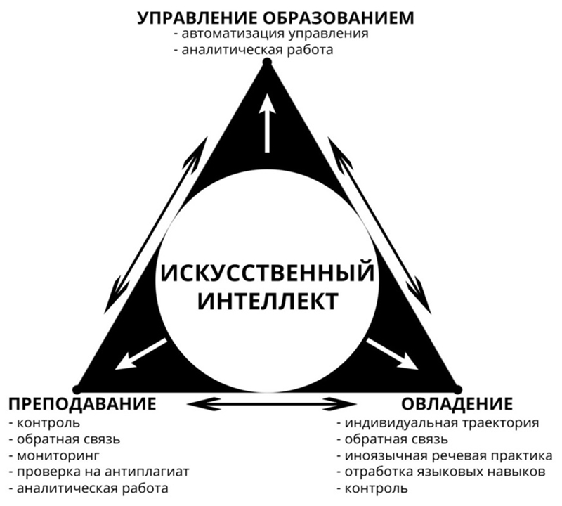 Исходя из содержания трех векторов, считаем, что компетенция преподавателя иностранного языка в области искусственного интеллекта будет включать два содержательных блока: педагогический, включающий общие вопросы организации образовательного процесса в целом и обучения иностранному языку в частности, и методический, относящийся непосредственно к методике обучения иностранному языку.