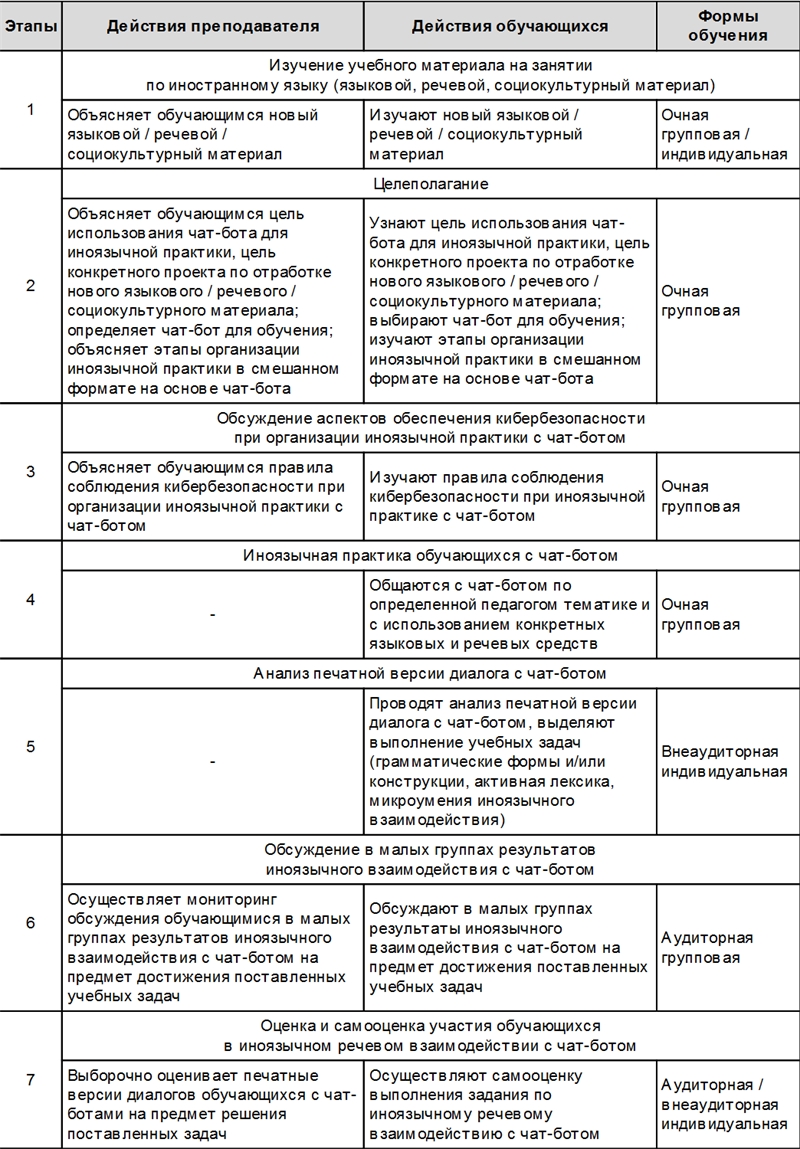При этом авторы справедливо утверждают, что иноязычная практика с чат-ботом не может быть «брошена на самотек» – на самостоятельную работу обучающихся. В этом случае при отсутствии контроля учебно-познавательной деятельности обучающихся со стороны педагога практика может носить формальный характер и не принесет тех результатов, которые потенциально могли бы быть достигнуты при более методически продуманном обучении. Кроме того, авторы утверждают, что иноязычная практика с чат-ботом должна выступать одним из этапов методики обучения, когда сначала в аудитории происходит изучение и отработка нового материала, далее учащиеся и студенты во внеаудиторное время на основе программ чат-ботов отрабатывают изучаемые языковые или речевые средства в процессе иноязычного взаимодействия с чат-ботом, а затем уже в аудиторных условиях проводят анализ и обсуждение результатов практики с чат-ботом на предмет решения ими коммуникативных задач. Контроль иноязычной практики обучающихся с чат-ботом осуществляется посредством обсуждения результатов этой практики в малых группах в классе. Полный алгоритм обучения, предложенный учеными, включает семь последовательных этапов (табл. 8).