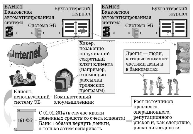 В первом случае речь идет о том, что возможны нарушения в процессах электронного хранения, передачи и обработки информации (искажение, уничтожение, перехват данных или злоупотребление ими в результате технических неполадок, действий хакеров, ошибок или мошенничества персонала и клиентов) и отказы в функционировании банковских информационных систем (возникновение перегрузок из-за недостаточной мощности аппаратно-программного обеспечения и целенаправленных DoS-атак на веб-серверы банка).