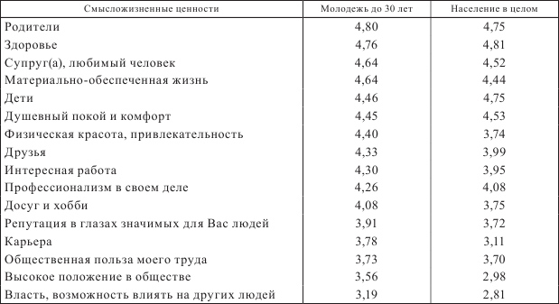 Таблица 1. Смысложизненные ценностные ориентиры белорусской молодежи (средний балл[2])