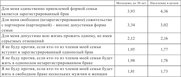 Однако следует отметить, что молодые люди менее категоричны в своих оценках зарегистрированного брака как единственно приемлемой формы семьи. При этом оценки допустимости создания так называемого гражданского брака среди молодежи выше, чем в более старших возрастных группах. Иными словами, вместе с ростом положительного отношения к сожительству как допустимой форме семейных отношений у молодежи наблюдается уменьшение значимости зарегистрированного брака как единственно приемлемой формы семейных отношений.