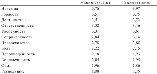Данные, представленные в табл. 4, свидетельствуют о том, что наиболее часто по отношению к Беларуси молодежь, как и население в целом, испытывает надежду, гордость, достоинство и ответственность. Однако следует отметить, что наиболее позитивное эмоциональное отношение к современной Беларуси демонстрируют лица старше 55 лет в отличие от молодежи, которая проявила большую критичность.