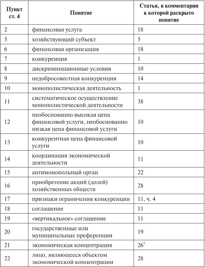 1. В комментарии к настоящей статье раскрываются лишь несколько понятий, приведенных в ст. 4 Закона о защите конкуренции: товара, взаимозаменяемых товаров, товарного рынка и потребителя. Иные понятия, приведенные в ст. 4 Закона, раскрываются в комментариях к статьям, к которым такие понятия имеют непосредственное отношение.