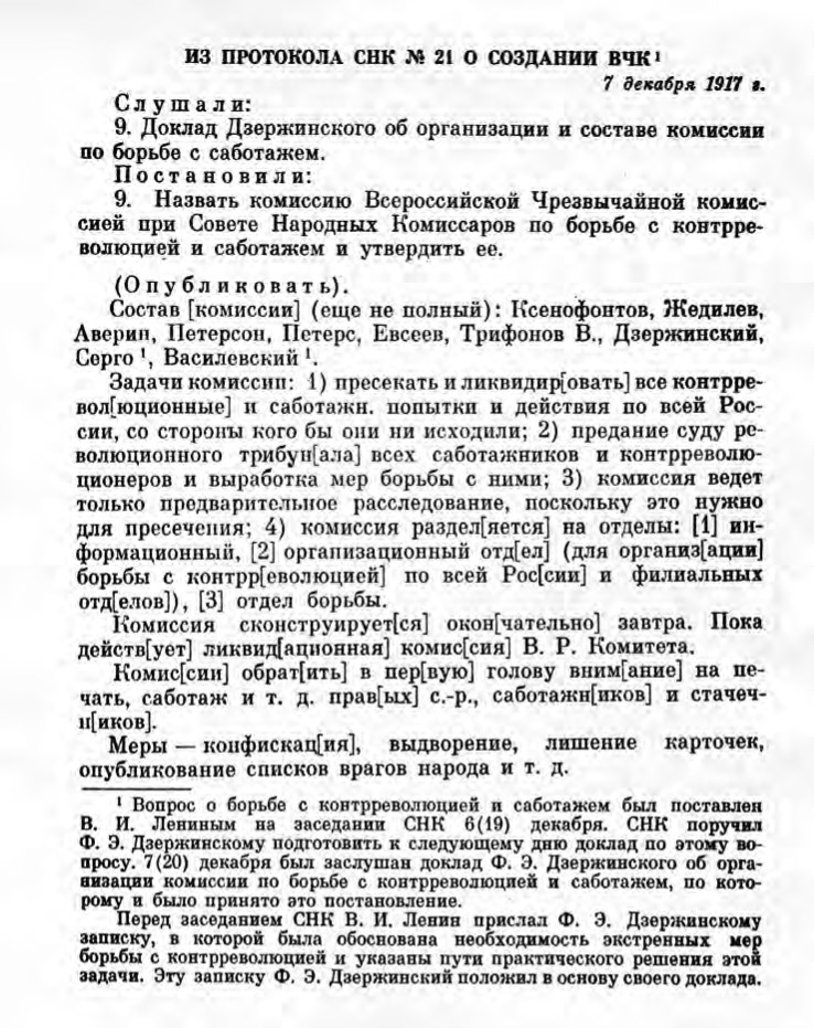 Выписка из протокола СНК № 21 от 7 декабря 1917 г. о создании ВЧК. Декабрь 1917 г.