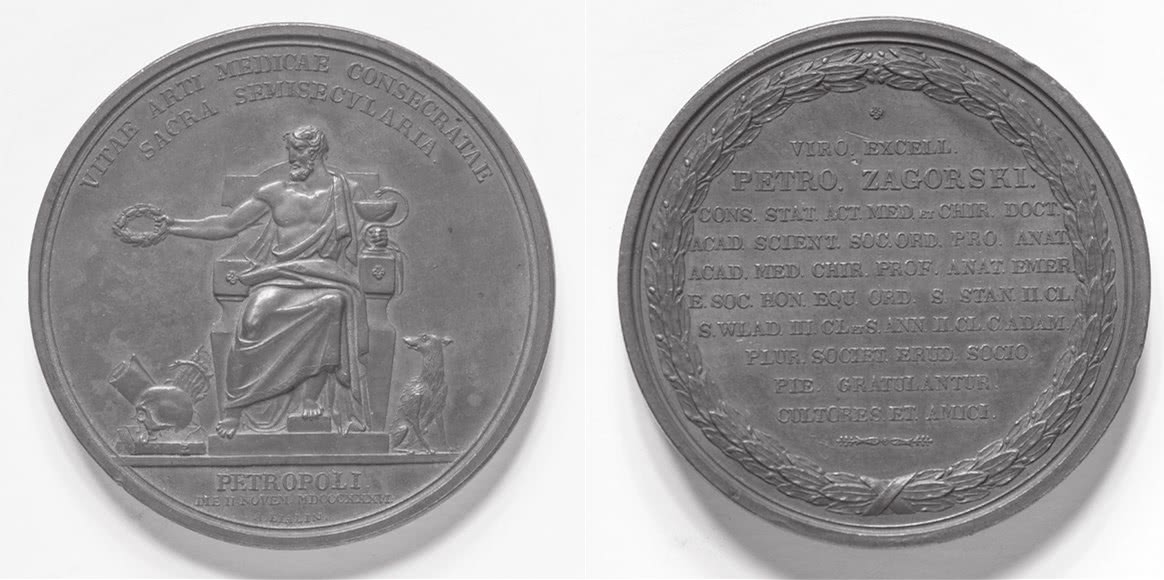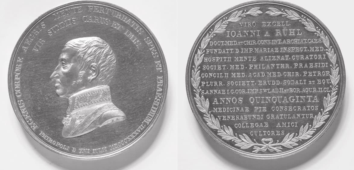 Перед глазами у Уткина, несомненно, находились юбилейные медали в честь заслуженных медиков. Напомним, что до крыловского юбилея были отчеканены медали в честь П.А. Загорского и И.Ф. Рюля; в том же 1838 г. эта линия будет продолжена медалью в честь 50-летнего юбилея врачебной деятельности лейб-медика И.Ф. Буша. Все они были выполнены одним автором – академиком Академии художеств А.П. Лялиным. На их реверсе по сложившейся традиции располагалась весьма пространная латинская надпись с обилием сокращений – приветствие юбиляру от имени его друзей, учеников, почитателей и благодарных пациентов; мелкие буквы делали ее трудночитаемой. Аверс, начиная с медали в честь Рюля, отводился под профильное изображение юбиляра в мундире с орденами и лентами, также обрамленное надписью.