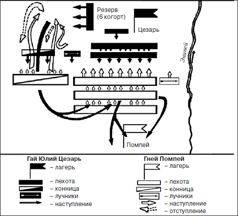 Цезарь разгадал замысел Помпея и расположил свои войска следующим образом. На правом фланге – лучший легион, возглавляемый самим полководцем; на левом, упиравшемся в реку, размещались два легиона, понесшие наибольшие потери в предыдущих боях. Остальная пехота располагалась в центре. Конница находилась на правом фланге. Видя, что на данном направлении Помпеи все равно будет иметь преимущество, Цезарь взял с третьей линии шесть когорт наиболее опытных воинов (около 2 тыс. человек) и оставил их в резерве за правым флангом с заданием поддерживать конницу.